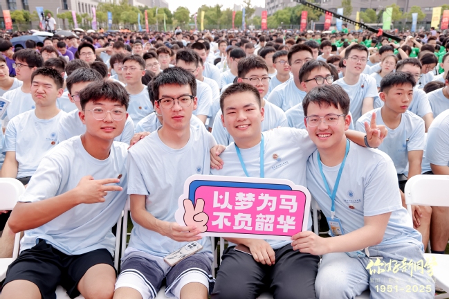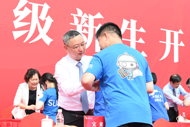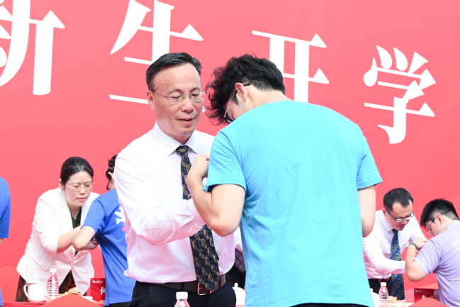 在典礼现场,主席台领导为2025级新生代表佩戴校徽并赠送书籍《习近平与大学生朋友们》,寄托学校对新生矢志报国、砥砺奋进的殷切期盼。