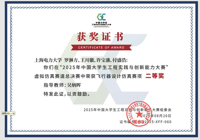 此外,由工训中心冯巧波、王春亮老师指导,能机学院翁尹昕、陈远飞、王海硕、李俊超等四位同学组队参加新能源车赛道温差能电动车赛项;能机学院吴炳晖老师指导,能机学院罗淋方、王川徽、许宝藩、付盛浩等四位同学组队参加虚拟仿真赛道飞行器设计仿真赛项。两支队伍各自斩获了国家级二等奖。