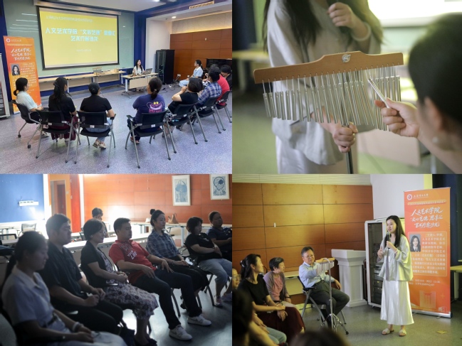 艺术疗愈沙龙则由罗黛老师精心设计,通过低频乐器与自然声音的沉浸式体验,为教师们打造了一场“心灵SPA”:海浪音的轻柔波动、雨棍的细密私语、颂钵的悠远共鸣……教师们闭目聆听,在自然与艺术的双重疗愈中释放压力。老师们分享道:“当乐器的声音与自然声交织时,仿佛置身森林深处,所有的疲惫都随着声波消散了。”