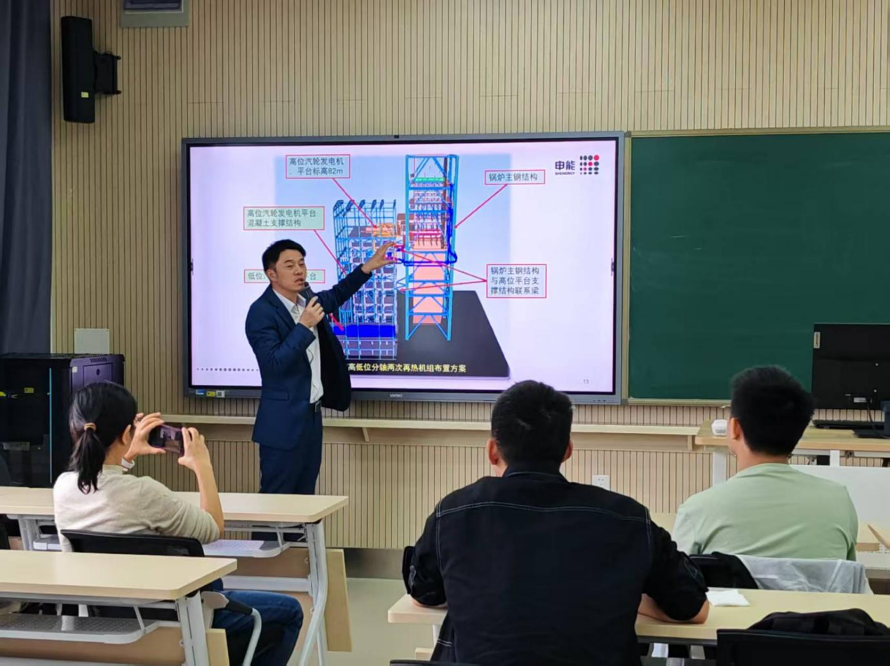 课堂上,杨文虎结合多年行业实践经验,在系统阐述高效低碳火力发电技术发展趋势的基础上,重点围绕“单元机组集控运行”课程的核心知识点,以申能集团的经典项目为教学样本展开讲解。其中,上海外高桥第三发电厂项目和华润曹妃甸项目为课程提供了技术演进参考,而国家示范工程——申能安徽平山电厂二期工程,则成为“单元机组集控运行”课程的“活教材”。