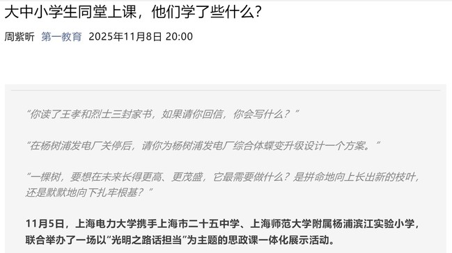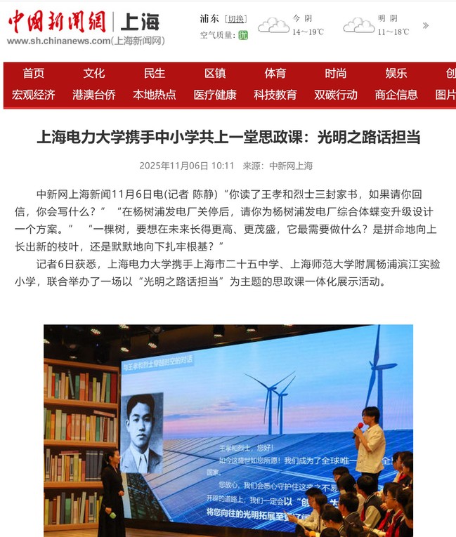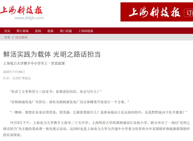 日前,我校携手上海市二十五中学、上海师范大学附属杨浦滨江实验小学,以“光明之路话担当”为主题,联合举办了一场大中小学思政课一体化教学展示活动。学校宣传部协同马克思主义学院积极挖掘新闻亮点,凝练工作特色,及时组稿向各大媒体推介。中国新闻网、中国科学报、上观新闻·新民晚报、澎湃新闻、上海科技报、第一教育等多家主流媒体纷纷予以报道,在社会层面展示了我校推进大中小思政课一体化的创新探索。