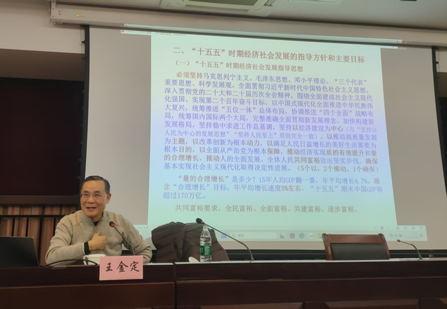 王金定教授以《为实现“十五五”规划目标而努力奋斗》为题,系统解读《中共中央关于制定国民经济和社会发展第十五个五年规划的建议》,深入阐释“十五五”时期面临的国际、国内复杂形势,详细讲解了“十五五”时期经济社会发展的指导方针、原则、目标以及加快高水平科技自立自强、扩大高水平对外开放等一系列重大战略部署,报告站位高远、脉络清晰,帮助退休党务工作者进一步把握国家未来发展脉络。