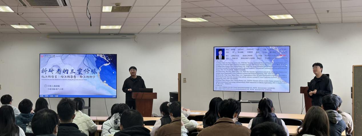 11月25日,人工智能学部在致远楼举办“研途青年说”学长沙龙——科研经验分享活动,邀请优秀博士生陈思翰(2025届毕业生)分享科研经验。陈思翰的研究方向包括智能配电网与微电网优化运行、电力系统韧性提升技术等,已在国际知名期刊发表多篇论文,并参与国家自然科学基金项目。他从心态、思维、行动三个维度展开分享,强调了调整心态、培养科研思维和高效行动的重要性,为同学们提供了宝贵的科研经验。“研途青年说”学长沙龙由学部研究生会主办,旨在通过优秀朋辈的分享,满足研究生的学术需求,营造良好的校园学术环境。