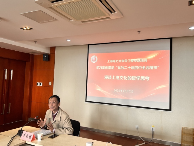 我校教授、上海市哲学学会顾问李家珉以“漫谈上电文化的哲学思考”为主题作报告。李家珉教授从学习贯彻党的二十届四中全会精神出发,讲述了在文化强国建设实践中,以社会主义核心价值观为引领,发挥文化“养心志、育情操”的重要作用,要通过文化建设涵养昂扬奋发的精神气质。他讲道,在推进校园文化建设过程中,要特别注重用好红色资源,加强青年信念教育,大学文化不仅是知识的传承,更是精神的塑造和价值的引领。