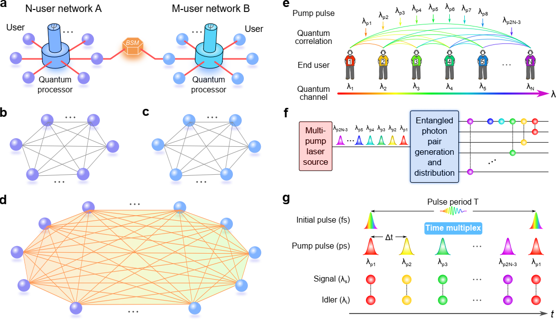 在本项工作中,我们针对量子融合中的关键科学问题,开创性地提出了一种全新的量子通信网络构建新方案,即主动时间-波长复用方案(ATWM方案)(图e,f)。该方案中,每个用户只接收一个由分别与其他N-1个用户纠缠的N-1个时间上独立光子组成的波长信道。量子处理器将2N-3个在波长和时域上具有特定设计的定制泵浦脉冲通过自发参量下转换(SPDC)过程产生量子纠缠光子对。随后,纠缠光子对通过量子信道分发给最终用户。为了有效区分不同的光子对,我们使用时间复用方案来分离不同的泵浦脉冲。因此,用户可以根据光子到达时间区分不同的纠缠态。由于自发参量下转换过程中的能量守恒,下转换光子对是频率-时间纠缠的,其光谱相对于泵浦的中心波长是对称的。所以,用户的所有对称波长信道可以共享不同的纠缠态,从而创建网络的全连通图。