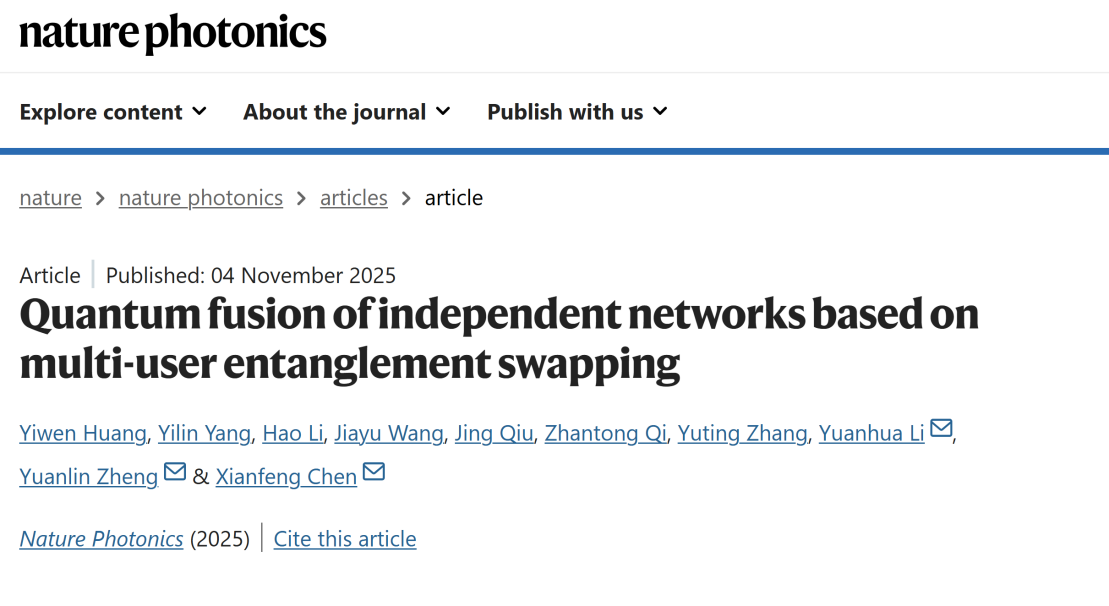近日,我校数理学院教师李渊华联合上海交通大学陈险峰、郑远林课题组首次提出了一种量子通信网络构建新方案,基于多用户纠缠交换实现了两个独立网络的量子融合。相关研究成果以“Quantum fusion of independent networks based on multi-user entanglement swapping”为题发表在国际顶级期刊Nature Photonics (DOI : 10.1038/s41566-025-01792-0)上。李渊华老师为本文第一通讯作者,上海电力大学为论文通讯署名单位。