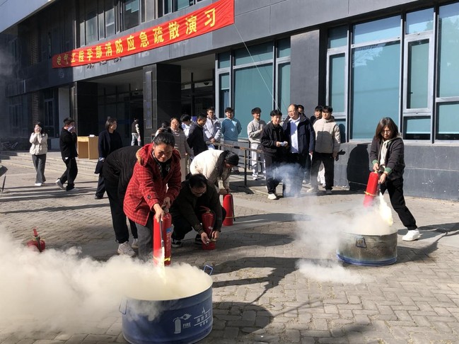 疏散环节结束后,全体参演师生在致远楼下集合。学校保卫处老师为师生现场讲解并示范了干粉灭火器的正确使用方法,强调了“提、拔、握、压”的操作要领。在认真观摩后,多名师生代表在保卫处老师的指导下进行了灭火器实操演练,亲身体验了如何迅速有效扑灭初起火源。