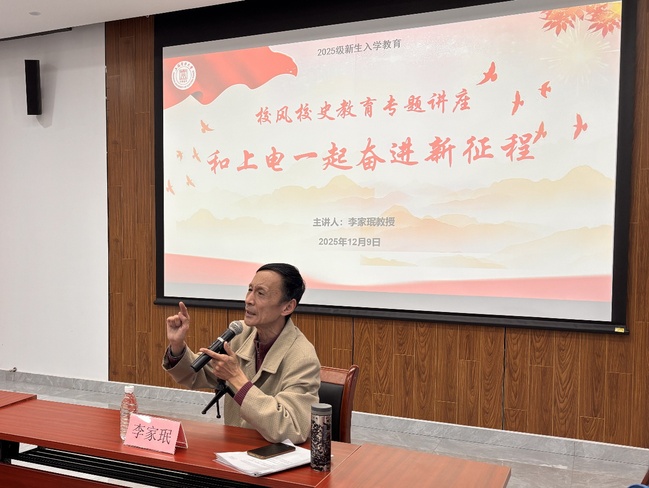李家珉教授围绕“和上电一起奋进新征程”主题,从学校历史讲起,详细阐释了我校“务实致用,明理致远”的办学理念、“爱国、勤学、务实、奋进”的校训和“立足电力、立足应用、立足一线”的办学方针内涵,寄语同学们既要脚踏实地学以致用,也要仰望星空怀有理想;他从“上电六桥”谈学校发展史,横跨冬涟河从南到北依次的五一桥、七八桥、八五桥、零零桥、零六桥、一八桥,每一座桥都代表学校的重大转折点;并以不同时期的成就和规划为线索,介绍学校所取得的辉煌成就,诠释一代代上电人“砥砺奋进、追求卓越”的精神风貌,并希望同学们以校史励志、以实际践行。