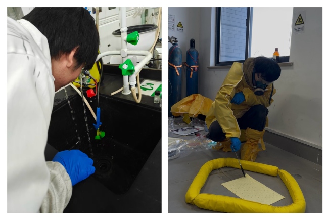 在实验安全培训环节,学院实验室老师结合高校实验室典型安全事故案例,从化学试剂的分类存放与规范取用、气瓶与危险化学品的管控要求、实验室应急防护设备的使用方法等多个维度展开系统讲解。针对化学实验中常见的酸碱泄漏、化学试剂溅入身体部位等突发状况,通过现场演示和互动问答的方式,指导师生如何快速启动应急预案、正确采取防护措施以及实施初期险情处置,让抽象的安全理论转化为可实操的技能。