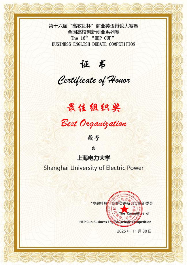 在此次比赛中,我校辩论队表现优异,团队斩获一等奖,学校荣获“最佳组织奖”,指导教师岑莉获评“最佳指导教师”,队长陈欣怡同学在资格赛(商务知识与词汇)环节夺得金奖,充分展现出我校学子扎实的专业功底和出色的综合能力。