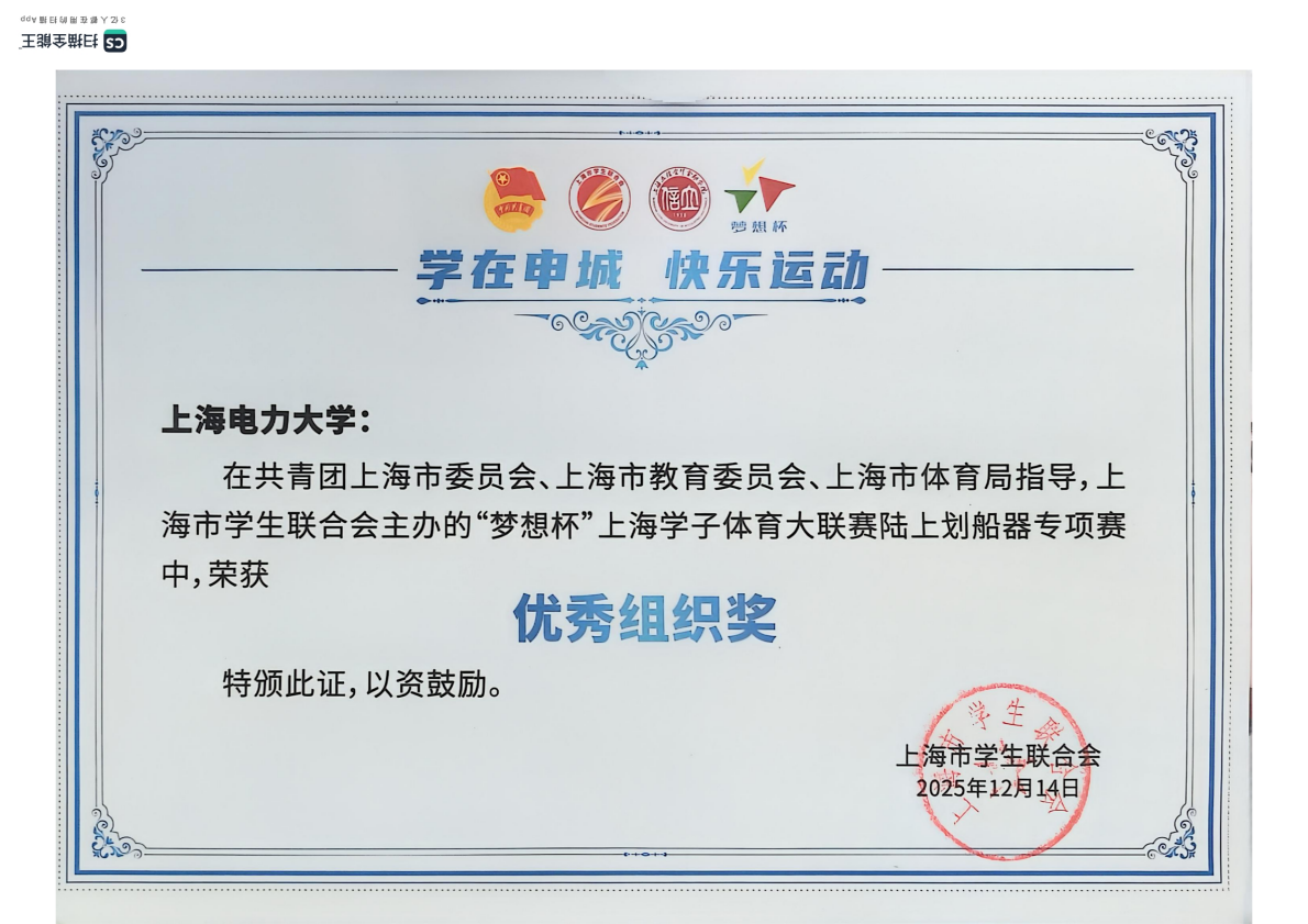 12月14日,由共青团上海市委员会、上海市教育委员会、上海市体育局指导,上海市学生联合会主办,上海立信会计金融学院承办的“梦想杯”上海学子体育大联赛陆上划船器专项赛在上海立信会计金融学院气膜馆落幕。本次赛事中,我校共选派6名优秀运动员组成代表队参赛,由人工智能学部薛楚恒老师担任领队,因表现出色,我校最终荣获“优秀组织奖”。