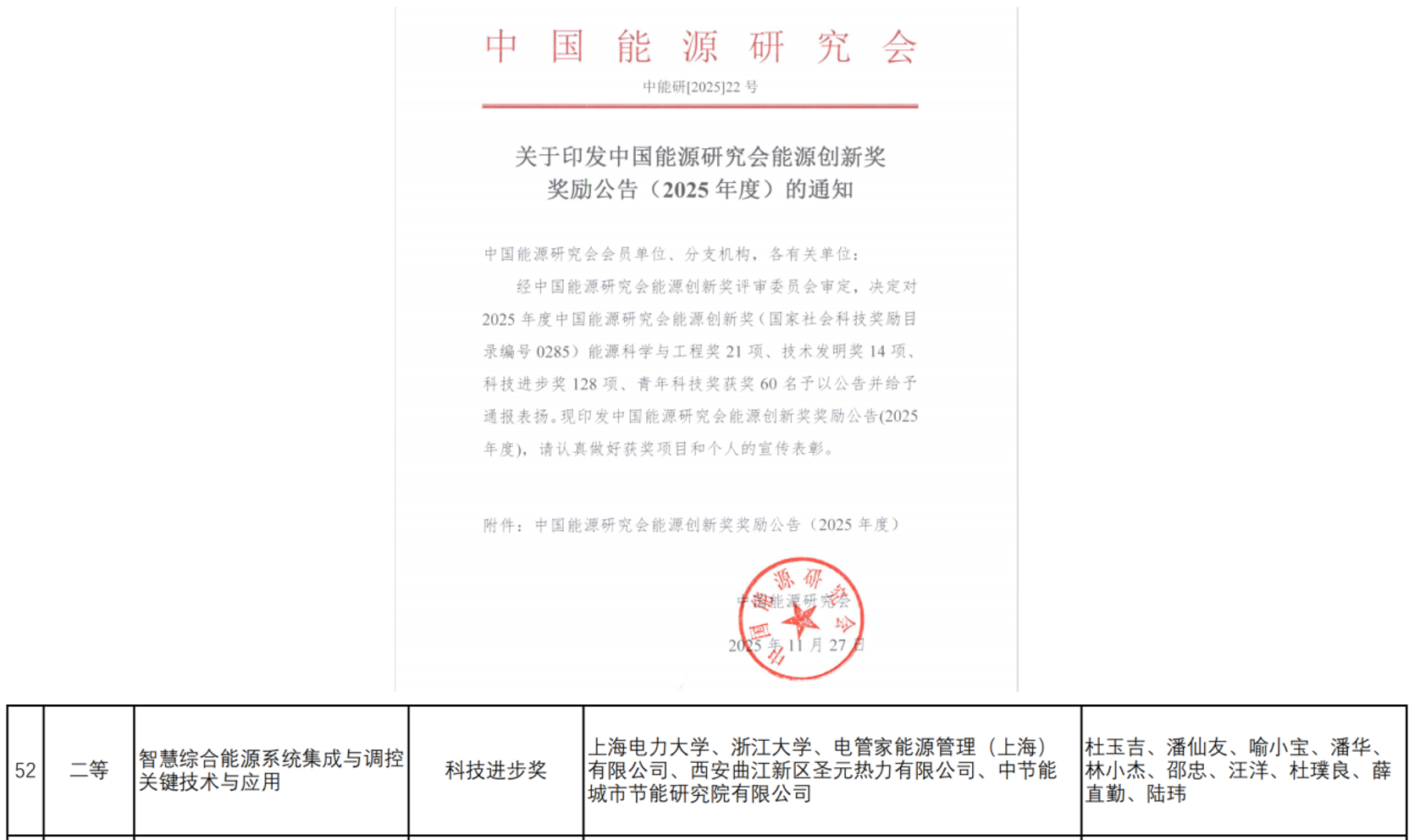 近日,中国能源研究会正式印发了中国能源研究会能源创新奖奖励公告(2025年度),经管学院牵头的《智慧综合能源系统集成与调控关键技术与应用》项目喜获科技进步二等奖,该成果由经管学院多位教师联合浙江大学、电管家能源管理(上海)有限公司等单位共同完成。