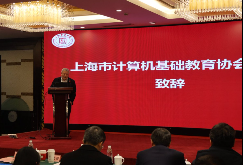 我校党委副书记、校长顾春华,上海市计算机基础教育协会理事长杨志强教授,副理事长刘晓强、孔令和、许华虎、王占全,我校本科生院副院长(主持工作)徐信艳,人工智能学部主任严怀成等出席会议。