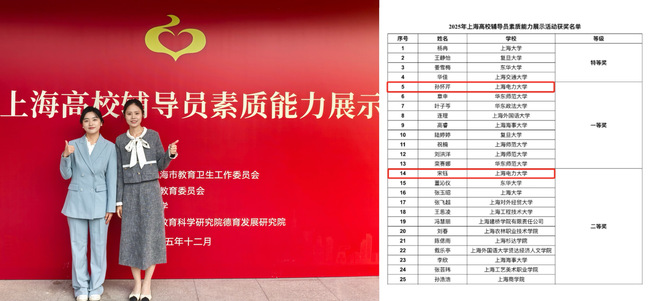 近日,由中共上海市教育卫生工作委员会、上海市教育委员会主办,东华大学和上海市教育科学研究院德育发展研究院承办的2025年上海高校辅导员素质能力展示活动圆满落幕。经过激烈角逐,我校人工智能学部辅导员孙怀芹、宋钰在众多优秀同行中脱颖而出,分别荣获一等奖和二等奖,充分展现了我校辅导员队伍扎实的职业素养与卓越的风采。