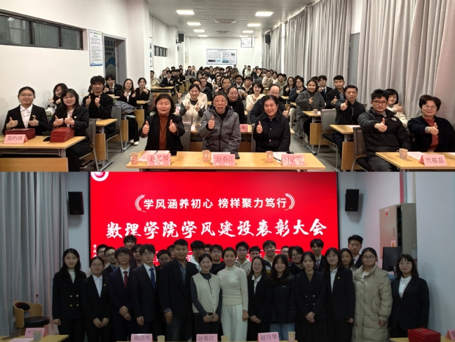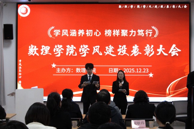 为深入学习贯彻党的二十届四中全会精神,紧扣“为党育人、为国育才”使命,以榜样力量涵育优良学风,12月23日下午,数理学院“学风涵养初心 榜样聚力笃行”2025年学风建设表彰大会在临港校区数理楼A110会议室举行。学院退休教授赵春江,学院党政班子成员、教师代表、全体辅导员、获奖学生代表和大一新生齐聚一堂,共同见证学院学风建设的丰硕成果。大会由数理学院2024级学生白志豪、余甜甜主持。