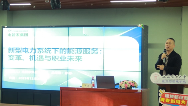 为精准对接行业发展需求,明晰新兴专业学生就业选择方向,深化校企协同育人成效,12月26日,经管学院依托职业(生涯)发展教育校外实践基地,特邀电管家集团董事长、总经理邵忠带来“新型电力系统下的能源服务:变革、机遇与职业未来”专题讲座。讲座由学院党委副书记孟延新主持,2023级至2025级能源服务工程专业学子参加本次讲座。