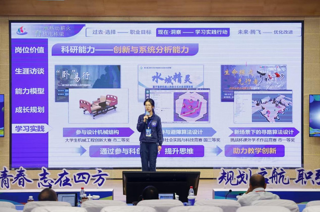 我校选手卢思坦依托学校能源电力特色与联合培养平台,围绕“核电教员”这一目标,生动讲述了一名未来“砺金者”从认知觉醒、能力锻造到使命确立的成长之路。她的故事深刻展现了上电学子将个人理想融入国家能源战略、以专业反哺家乡建设的责任担当。最终,其清晰的规划与真挚的情怀打动了评委,荣获成长赛道高教组银奖。