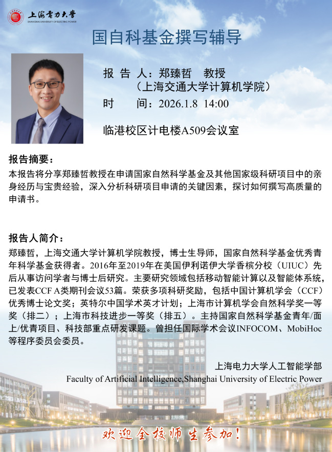 主讲人简介:郑臻哲,上海交通大学计算机学院教授,博士生导师,国家自然科学基金优秀青年科学基金获得者。2016年至2019年在美国伊利诺伊大学香槟分校(UIUC)先后从事访问学者与博士后研究。主要研究领域包括移动智能计算以及智能体系统,已发表CCF A类期刊会议53篇。荣获多项科研奖励,包括中国计算机学会(CCF)优秀博士论文奖;英特尔中国学术英才计划;上海市计算机学会自然科学奖一等奖(排二);上海市科技进步一等奖(排五)。主持国家自然科学基金青年/面上/优青项目、科技部重点研发课题。曾担任国际学术会议INFOCOM、MobiHoc等程序委员会委员。
