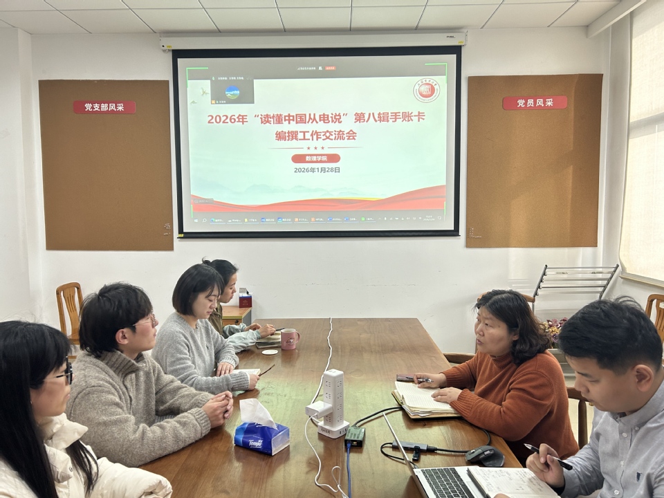 为持续推进我校2026年“读懂中国从电说”第八辑手账卡编撰工作,明确下一步的资料收集方向,数理学院于1月28日在数理楼A302会议室召开编撰工作交流会。会议采用线上、线下相结合的方式开展。校关工委老同志代表王鲁杨、数理学院党委副书记赵月琴、相关辅导员以及学生代表参加会议,会议由辅导员王亚霖主持。