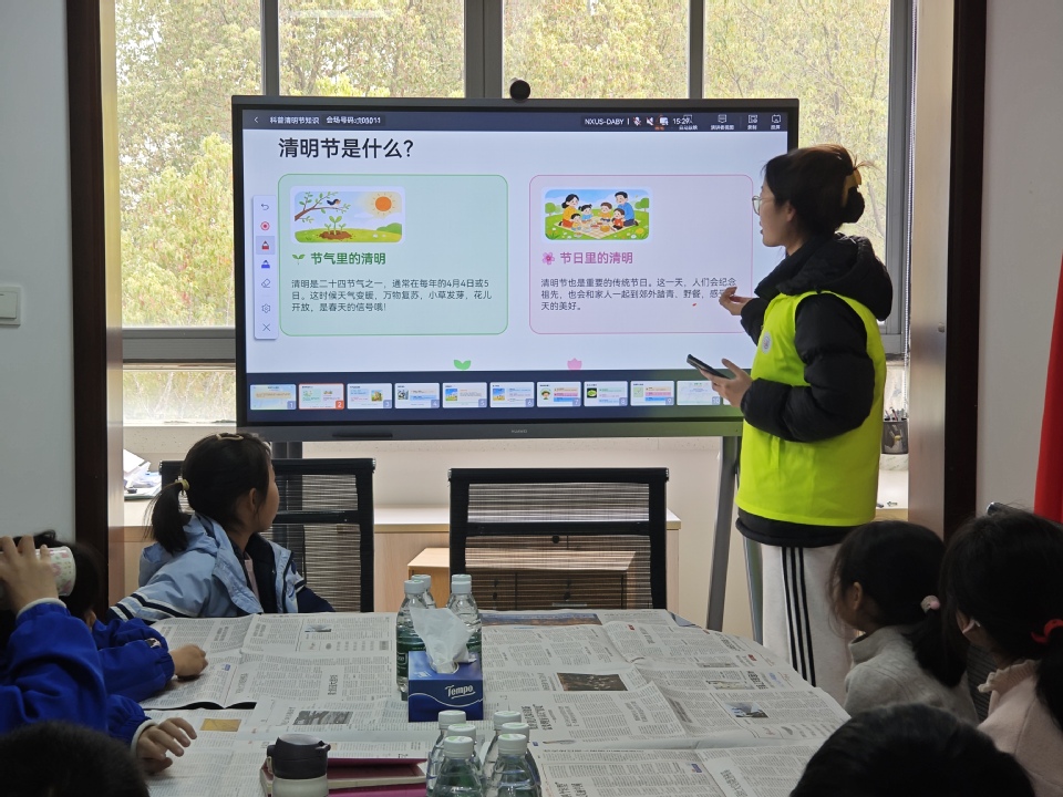 活动伊始,“小汤源”志愿服务队的志愿者们通过生动通俗的科普讲解,为孩子们全方位解读清明的文化内涵与节气特点,揭开清明的“双重身份”——既是万物复苏、草木萌发的节气信号,也是缅怀先人、寄托哀思、踏青寻春的传统节日。讲解过程中,志愿者们结合屏幕上的春景插画、民俗场景,用趣味问答、案例分享等形式调动孩子们的积极性,孩子们认真聆听、踊跃互动,眼中满是对春日美景与传统民俗的向往之情。