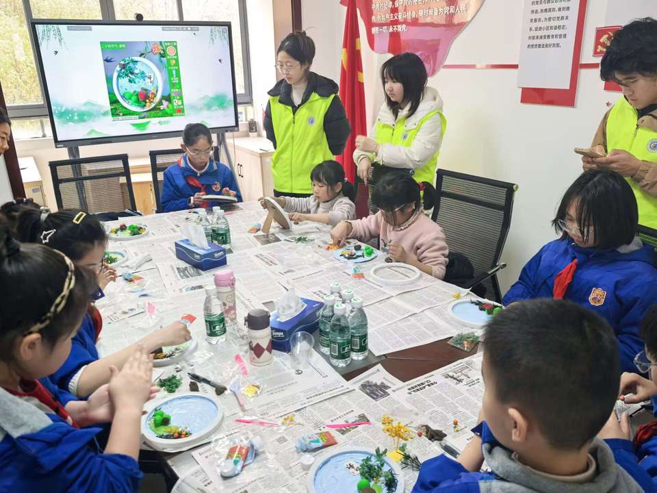 科普结束后,手工创作环节正式拉开帷幕。志愿者们提前准备好圆盘画纸、黏土、彩笔等材料,耐心向孩子们讲解创作技巧。孩子们化身“小小艺术家”,充分发挥想象力与创造力,在画纸上尽情挥洒灵感:用黏土捏出嫩绿的柳枝、娇艳的春花,用彩笔勾勒出清明踏青的温馨场景,将对春天的喜爱、对传统的理解,都凝注在指尖的每一次按压、每一笔描绘中。志愿者们全程俯身陪伴,一对一耐心指导,及时帮助孩子们化解创作难题,鼓励孩子们大胆表达创意,让每一份童真与热爱都能自由绽放。