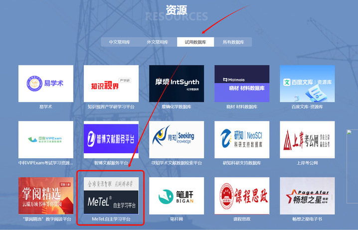 (或通过路径:图书馆主页/试用数据库/MeTel数据库)