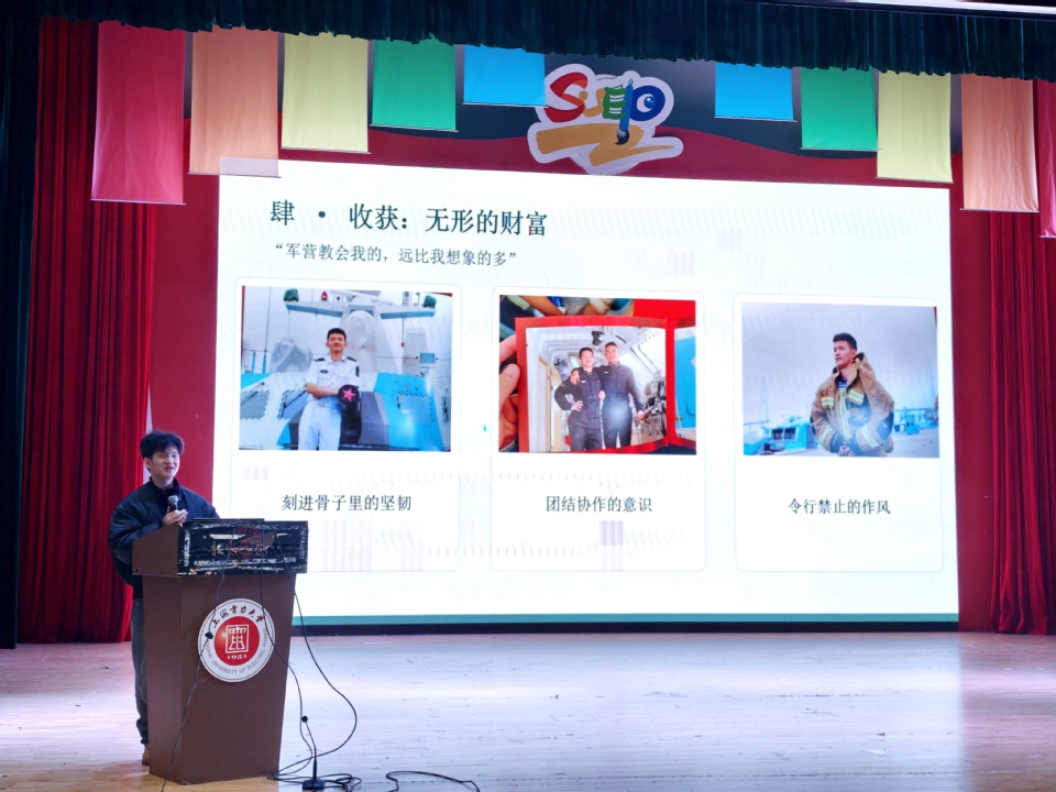 为让宣讲更具针对性、更富感染力,学院特别邀请优秀退役大学生士兵赵鸿宇分享自身经历。他以自身入伍经历为切入点,生动讲述了从入伍初心的确立,到军营里训练生活的点滴日常,再到返校后的成长蜕变,用真实的故事、真挚的感悟,展现了军营生活对个人意志品质、责任担当的锤炼与提升。他坦言,军营是青春最耀眼的舞台,参军经历不仅是人生中宝贵的精神财富,更让他学会了坚守与担当。他鼓励在场同学勇敢迈出步伐,选择军营、奉献青春,收获不一样的人生历练。