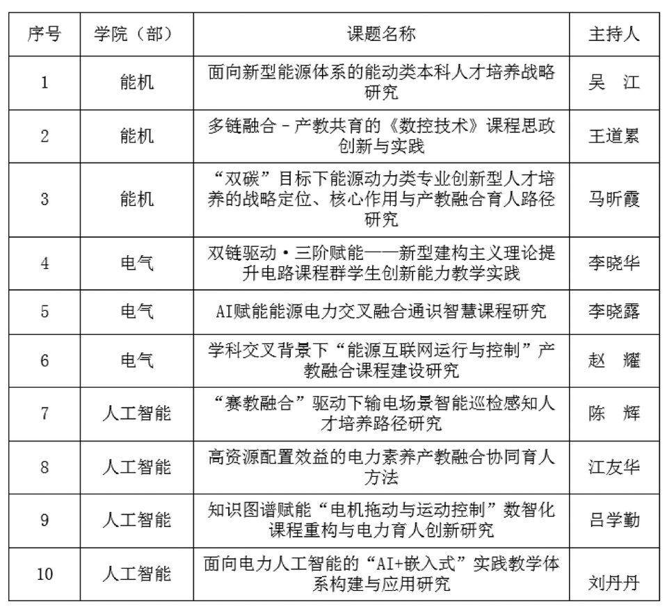 本次获批课题主要聚焦于课程思政建设、创新人才培养、深化产教融合、推进交叉融合、打造智慧课程、优化实践教学等重要领域,研究方向兼具科学性、前瞻性与实践性,充分凸显了电力教育的新亮点,体现了我校教学改革研究与行业人才培养需求的深度契合,展现了学校本科教育教学改革的持续探索与显著成效。
