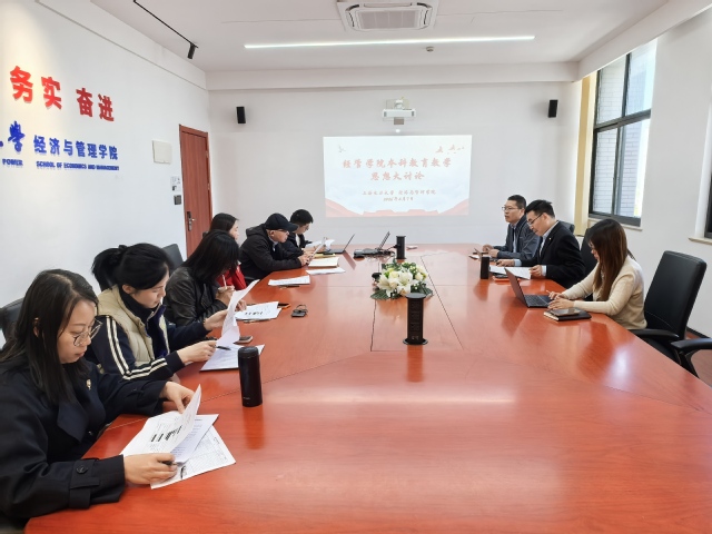 为了深入贯彻全国教育大会精神,深化本科教育教学改革,4月7日下午,经济与管理学院组织学院层面开展2026年度本科教育教学思想大讨论。学院院长杜刚、党委副书记孟延新、院务秘书杨迎春和各系部主任、副主任参加了本次讨论会。会议由杨迎春主持。