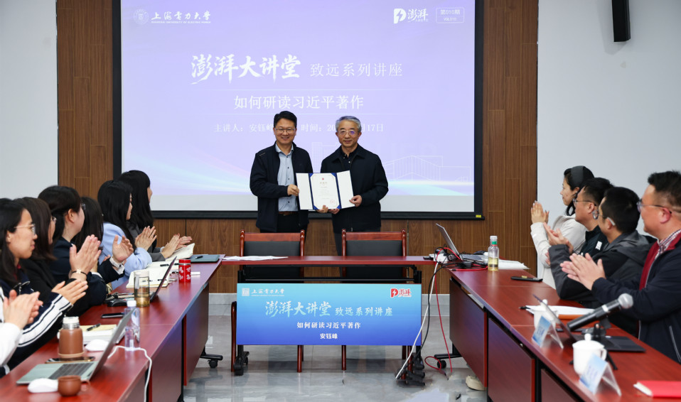 4月17日下午,上海电力大学建校75周年高质量发展系列活动之“澎湃大讲堂”致远系列讲座第十期暨马克思主义学院“思想理论大讲堂”第一讲在临港校区学术楼举行。北京大学校务委员会副主任兼秘书长(正局级),中国高等教育学会马克思主义研究分会理事长安钰峰教授应邀做题为《如何研读习近平著作》的主题报告。校党委副书记、副校长朱克勇出席,并向安钰峰教授颁发“澎湃大讲堂”感谢状。马克思主义学院全体教师参加学习,学院党委副书记(主持工作)张宗峰主持报告会。