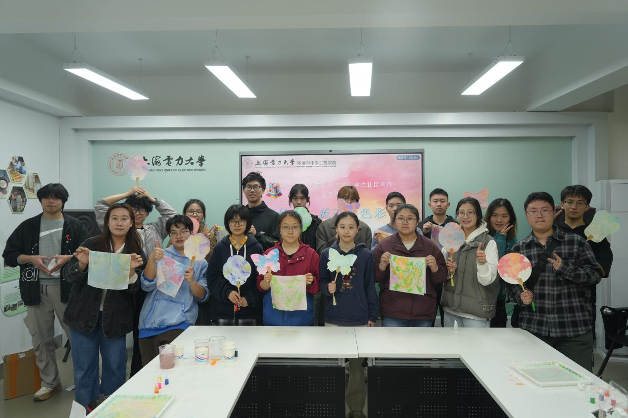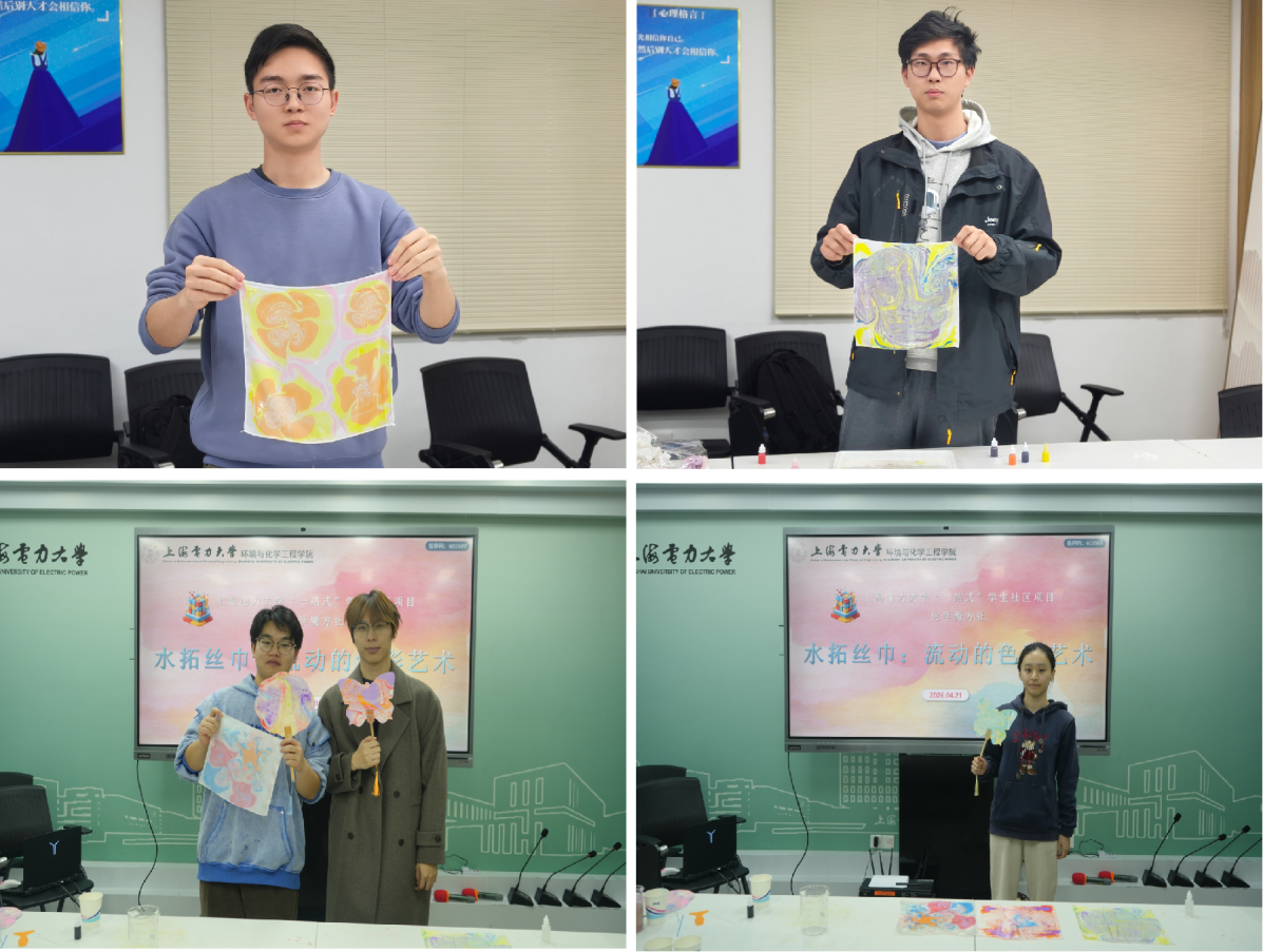 在实践环节,同学们化身“化学艺术家”,亲手调配颜料,控制滴加顺序与力度,观察并引导色彩在水面因表面张力与流体动力学作用形成的独特纹样。从胶体溶液的制备到界面图案的精准拓印,整个过程宛如一场精妙的化学实验。当丝巾轻覆水面,水中的瞬间图案被永久固定,这一“转印”步骤也蕴含着丰富的材料表面处理原理。同学们创作出的每一幅独一无二的丝巾作品,不仅是艺术表达,更是一次成功的“化学应用”成果展示。活动不仅让同学们体验到非遗手作的乐趣,更搭建了一个以趣味实践反观专业理论的平台。同学们在交流创作心得的同时,也自发探讨了活动中涉及的化学现象,实现了从“知识接收”到“兴趣探索”的积极转变。