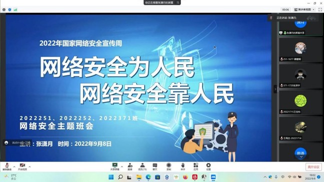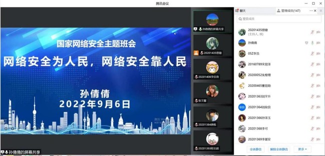 营造清朗空间,主题班会“云研讨”。学院结合今年国家网络安全宣传周主题“网络安全为人民 网络安全靠人民”开展线上主题班会,组织学生交流、研讨目前国内外网络安全形势、网络安全案例及安全防范方法等。针对科技安全,学生进行了深入的交流讨论,指出依靠科学技术,提高综合国力才是提升科技安全的重要手段。此外,各专业、各班还立足近期疫情形势,结合疫情期间暴露出的国家安全事件,以公共卫生安全、生物安全等为重点内容,在学生中开展宣传教育。学生们结合疫情期间的感悟,碰撞思维火花,激扬当代大学生维护国家安全的青春风采。