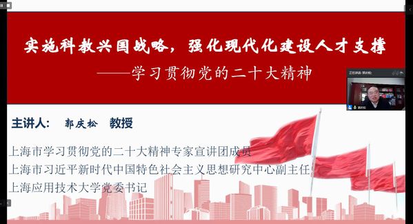为深入学习贯彻党的二十大报告提出的科教兴国战略、人才强国战略、创新驱动发展战略,上海市学习贯彻党的二十大精神专家宣讲团成员、上海市习近平新时代中国特色社会主义思想研究中心副主任、上海应用技术大学党委书记郭庆松教授应邀为我校党的二十大精神学习研讨班(处级干部轮训班)专家讲座暨党委中心组(扩大)学习会作“实施科教兴国战略,强化现代化建设人才支撑”的线上辅导报告。报告会由校党委书记李明福主持。