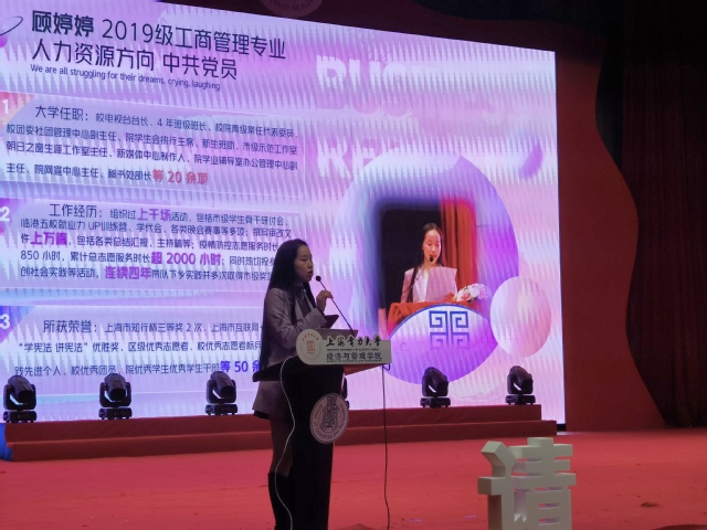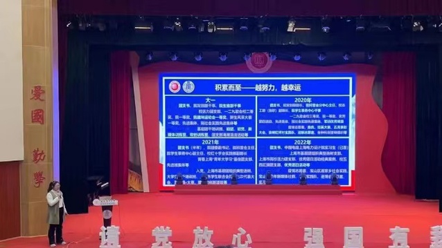 “挑战杯”上海市大学生课外学术科技作品竞赛一等奖、青年五四奖章集体、“知行杯”上海市大学生社会实践项目大赛一、二、三等奖等十余项奖项获得者来自电子与信息工程学院的顾佳明分享了她作为赴宁夏固原实践队一员时的所见所感,并从实践准备、实践项目实施、实践对宣传推广等角度分享了参与社会实践的经历和经验,鼓励同学们积极投身社会实践的大舞台,在社会实践中了解社会、磨练意志、锻炼品质,增长才干!