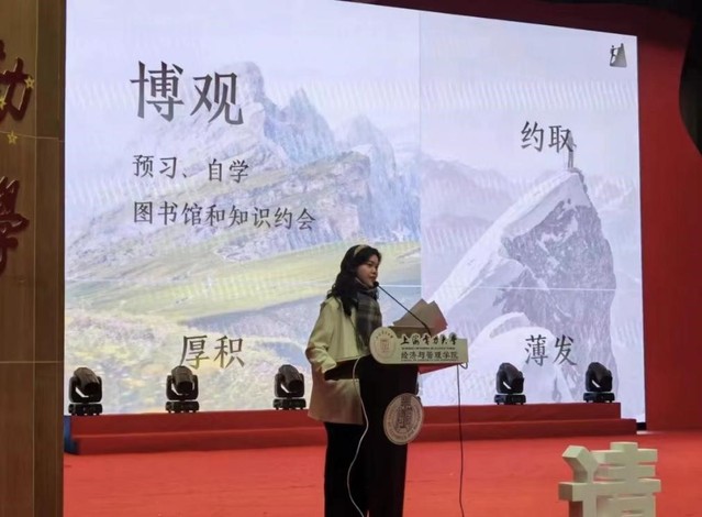 优秀学生干部顾婷婷将大学四年比作一个追光的过程,即“追寻光、靠近光、成为光”。在大学的期间,同学们应该笃定信仰,立下目标,给自己的大学生活做出合理规划并不断努力完成目标。她用自身成长经历,鼓励同学们,认真做好自己,努力成为自己的光。
