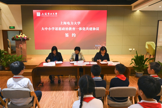 在当天举行的上海电力大学大中小学思想政治教育一体化实践基地揭牌仪式上,上海电力大学与二十五中学、平凉路第三小学分别签署共建协议。三方共同期待能以此次共建为契机,在资源共享、项目共研、课程共建、人才共育等方面建立长期深入的合作关系,在丰富实践活动、优化育人载体、创新课程教学等方面凝聚资源和优势,全面提升各学段人才培养质量。