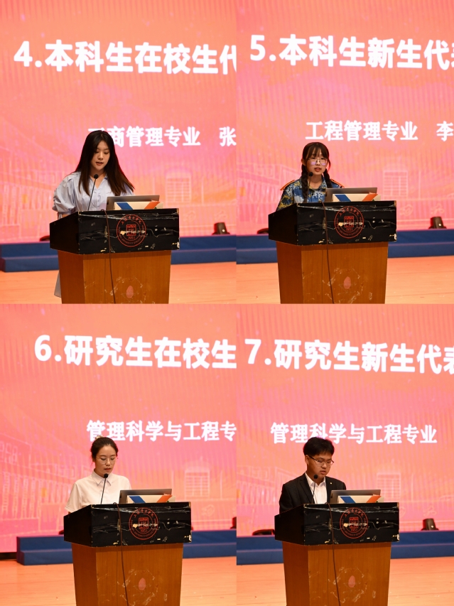 本科生在校生代表、校学生会执行主席张雅婷,根据自身的大学生活向新生分享了自己的心得。她建议要多尝试结识优秀的人,也要多思考从而更好的认识自己。本科生新生代表李禹霏制定了大学生活的目标,她也表示上电经管人定会践行“勤学、奋进、爱国、务实”的精神,开启人生的新起点,在志存高远中砥砺前行。