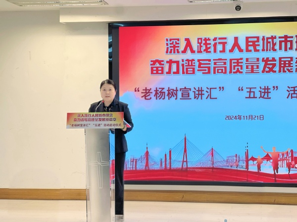 定海路街道党工委副书记、办事处主任李荣在启动仪式上致辞,她指出:总书记的重要回信,纸短情长,内涵丰富,街道各党建联建成员单位要加强联学联建,通过“五进”活动提升政治理论素养,共同推动人民城市建设,共创社区幸福美好生活,以实际行动,回应总书记和党中央的关心关怀。